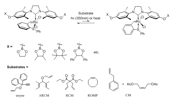 Herein, we report our preliminary results on the synthesis and activity of photo- and thermal- activated latent sulfur chelated ruthenium complexes3 bearing dendritic N-Heterocyclic Carbene (NHC) ligands with boronic ester appendages as a new type of chameleon catalysts. By transesterification of the boronic ester termini of different catalysts (generations) with diols we investigate the effect on selectivity for different types of olefin metathesis reactions (RCM, CM, ROMP, etc.) and substrates.