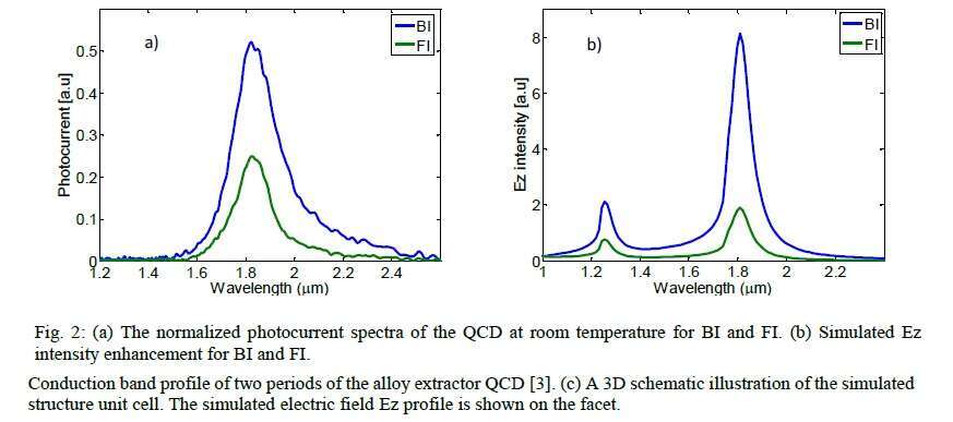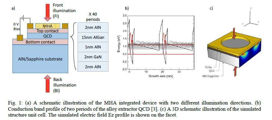 The fundamental building-block of a QCD consists of an active quantum well (QW) where electron excitation occurs upon photon intersubband (ISB) absorption, and multi-quantum well extractor that transfers the excited electron to the ground level of the following active QW. Major drawback of the QCD in applications based on normal light incidence is related to the polarization selection rule of QW inter-subband (ISB) transitions, allowing absorption only for an electric field polarized perpendicular to the QW layers (Ez). The use of two dimmensional metallic holes arrays (MHAs) allows coupling surface plasmons (SP) to absorption region of the QCD. The generated SP is a TM mode thus exhibits a dominant electric field component normal to the surface that is the proper polarization for exciting the ISB resonance. In the present work we show experimentally and by simulation that plasmonic enhancement performance of a QCD integrated with top MHA depends on the direction of the incidence light; normal Front Illumination (FI) or Backside Illumination (BI). In the study, it is shown that BI considerably increases the light coupling strength compared with FI. The peak responsivity is incresead from 1.77 to 2.72 mA/W at 1.82 μm by changing the light direction. For studying the effect of plasmonic Ez field depth decay on QCD performance, further work is being done on a new QCD sample that consists of 3 active periods.