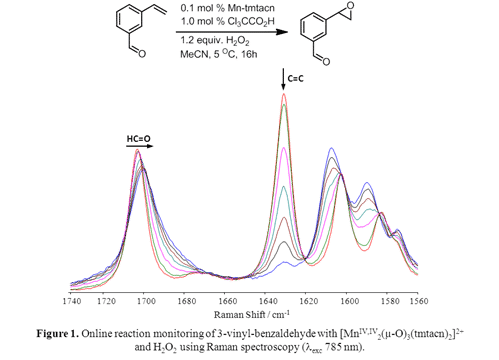 Over the last decade we have focused on the Mn-tmtacn (N,N’N”-trimethyl-1,4,7-triazacyclononane) family of catalysts1 for a wide range of oxidative transformations ranging from cotton and wood pulp bleaching2 to epoxidation and cis-dihydroxylation of alkenes,3-5 including the first manganese catalyzed asymmetric cis-dihydroxylation of alkenes.6 In this presentation we report the applications of these catalysts for selective oxidation of organic substrates with multiple oxidation sensitive functional groups including alcohols, aldehydes and alkenes and discuss the use of Raman spectroscopy for lead identification and reaction optimization. (Figure 1)