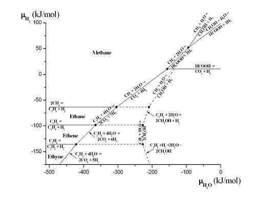 The С–Н system of aqueous alkanes, alkenes, and alkynes in hydrothermal environment presented as two-phase monovariant equilibria that divided the divariant areas of stability (the facies) of the hydrocarbons (Figure). The existence of those metastable equilibria of hydrocarbons in hydrothermal systems is experimentally proven [2].