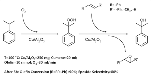 In our work, the reaction was performed at 100 °C in a flask, operating at atmospheric pressure of molecular oxygen (bubbling), in the presence of stilbene, cumene and Cu/Al2O3 catalyst, without iniziators or promoters. The results indicate the excellent reactant conversion and epoxide selectivity of the entire process, that occurs via catalytic oxidation of cumene to CHP followed by the catalytic epoxidation of stilbene with CHP. Indeed the separate study of the two reactions highlighted the fundamental role of the copper catalyst on both steps.