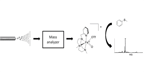 Because the vast majority of non-heme iron oxygenases contain cis-labile binding sites, synthetic iron(IV)-oxo complexes with tripodal tetradentate ligands are especially relevant from a biological point of view. However, they have proved to be less stable than their pentadentate counterparts, thus rendering their study more difficult. Some of us have recently described the preparation and spectroscopic and chemical characterization in solution of a new S=1 iron(IV)-oxo species with a tripodal tetradentate ligand that has remarkable thermal stability, especially when compared with structurally related complexes.[3] Herein, we make use of electrospray ionization to study the gas phase reactivity of this species. The mass-selected cation is capable of activating alkane C-H bonds and performs oxygen atom transfer to sulfides.