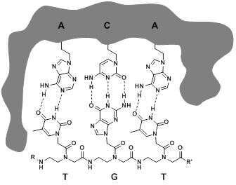 Figure 1. Concept of storing binary codes in MIP cavities. The TGT sequence (representing the binary code 101) of a peptide nucleic acid template is stored as its complementary sequence (ACA) in a molecularly imprinted polymer by applying nucleobase-functionalized monomers.