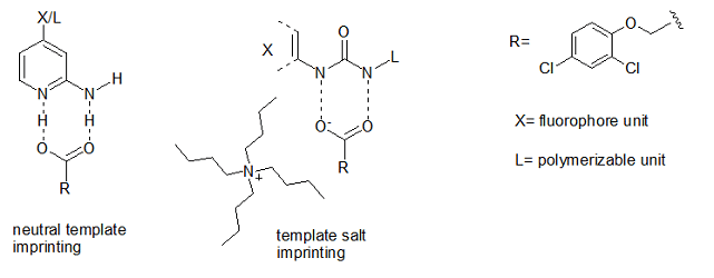 One of the issues in targeting acidic pesticides such as 2,4-D is the fact that usually their deprotonated form is used for imprinting in organic solvents, commonly as the tetraalkylammonium salt (Fig. 1).3 This approach harbours drawbacks when it comes to analytical rebinding, because real samples seldom contain such counterions. In our group, we have thus developed a new fluorescent probe monomer containing the 2-aminopyridine moiety, which forms strong enough intermolecular hydrogen bonds with the carboxylic acid group of neat 2,4-D (Fig. 1). During a titration of the probe monomer with the analyte, hydrogen bond formation is indicated by spectral shifts and fluorescence enhancement. Crystallography studies verified complex formation. The higher fluorometric response of the core-shell MIP compared to a non-imprinted control polymer proved successful imprinting.