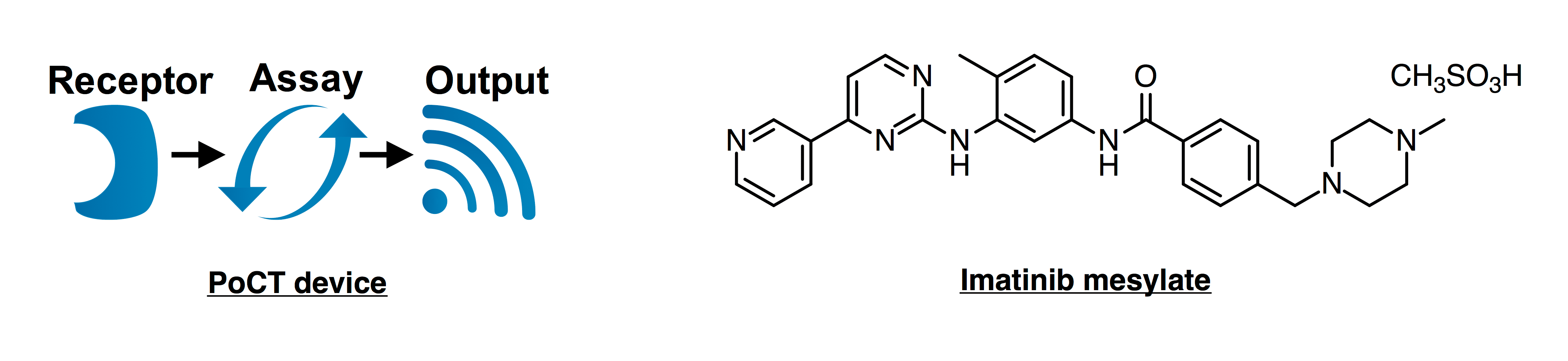 Tyrosine Kinase Inhibitors, such as Imatinib mesylate, are a class of anticancer drugs that would benefit from therapeutic drug monitoring (TDM) due to their high inter-patient variability in terms of efficacy.1 TDM is the measurement and interpretation of drug concentrations in biological fluids and can contribute to personalised drug dosing. There is a growing need for simple methods that allow for the quantification of drugs concentrations in blood-plasma; current analysis methods, such as HPLC-UV and LC-MS, provide reliable data but require expensive equipment, extensive sample preparation and skilled operatives.2