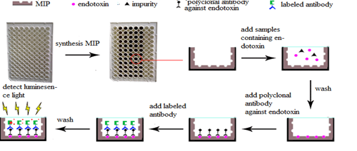 Monitoring trace endotoxin in water is difficult because it requires highly sensitive and selective analytical methods. For the first time, a new sandwich enzyme-linked immunosorbent assay (ELISA) based on molecularly imprinted polymers (MIPs) was established for sensitive and accurate endotoxin determination. MIPs selectively recognized polysaccharides of endotoxin were prepared on the surface of microplate by dopamine self-polymerization method. The MIPs were used as capture antibodies to separate and enrich trace endotoxin selectively. Then anti-endotoxin antibodies selective to lipid A of endotoxin were applied as the primary antibodies to quantify the endotoxin captured by MIPs. With selective sample pre-treatment and ELISA together, MIP-based sandwich ELISA could detect trace endotoxin (10-5-105μg/L) in different water containing interferences (phytohemagglutinin, ions, humic acid and albumin ) at different pH levels (from 3 to 9 ) with recoveries ranged from 82.3% to 105.8%. MIP-based sandwich ELISA had higher sensitivity and wider detection linearity than limulus amoebocyte lysate assays (LAL) and indirect competitive enzyme-linked immunosorbent assay (ic-ELISA). The MIP-based sandwich ELISA provides a sensitive, accurate and stable solution to detect trace endotoxin in water.