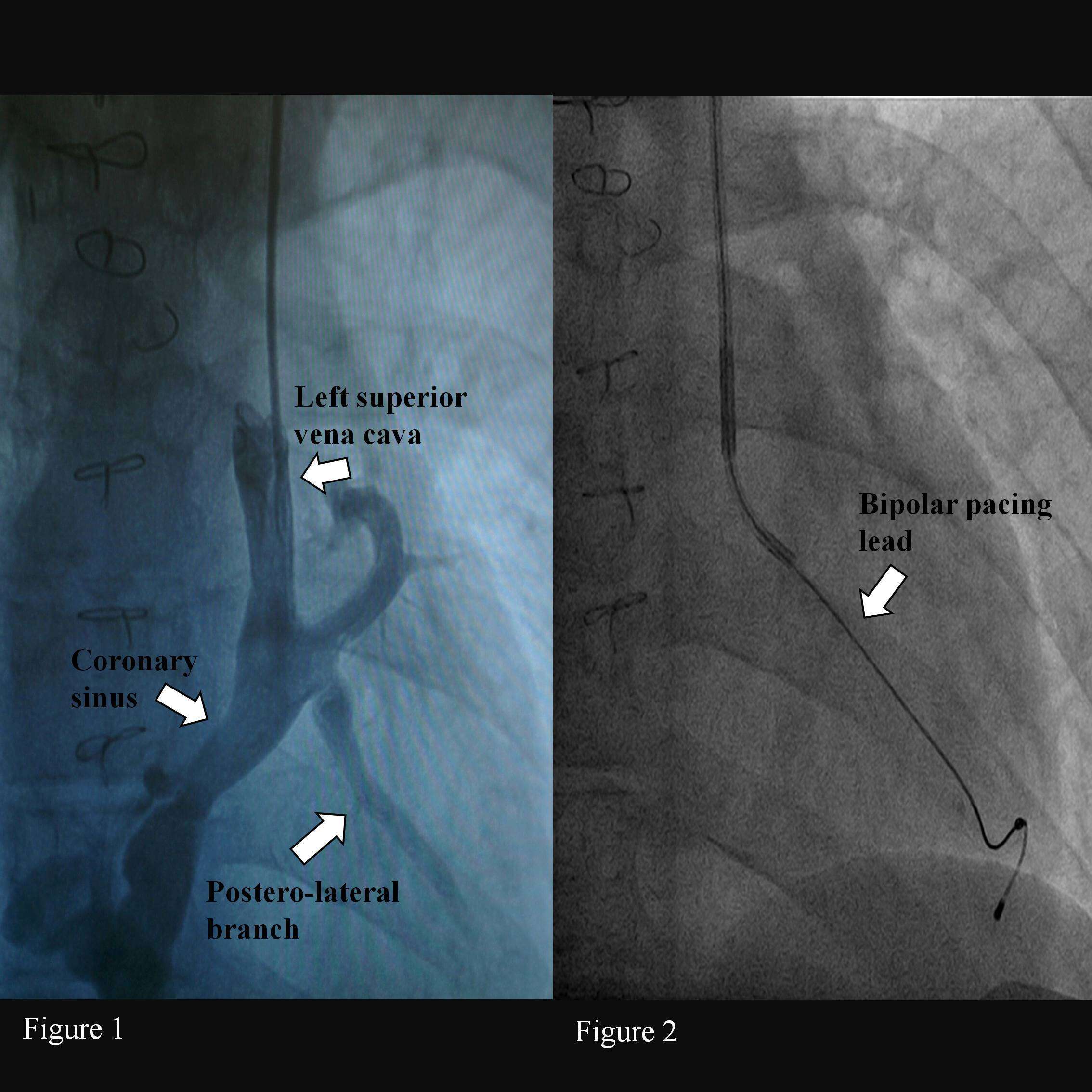 Pacemaker implantation. After left axillary vein puncture a guide was inserted in the LSVC. Through a peel-away 9 Fr introducer an angiography was performed. The angiography showed the presence of a wide CS with a postero-lateral collateral straight on (fig.1). A CRT sub-selection catheter was introduce in the ostium of the